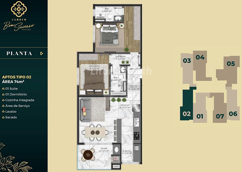 Apartamento tipo 01 – 75,66m² 02 Suítes + Lavabo Apartamento tipo 02 – 71,56m² 01 Suíte + 01 Dormitório
