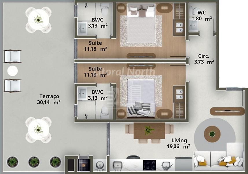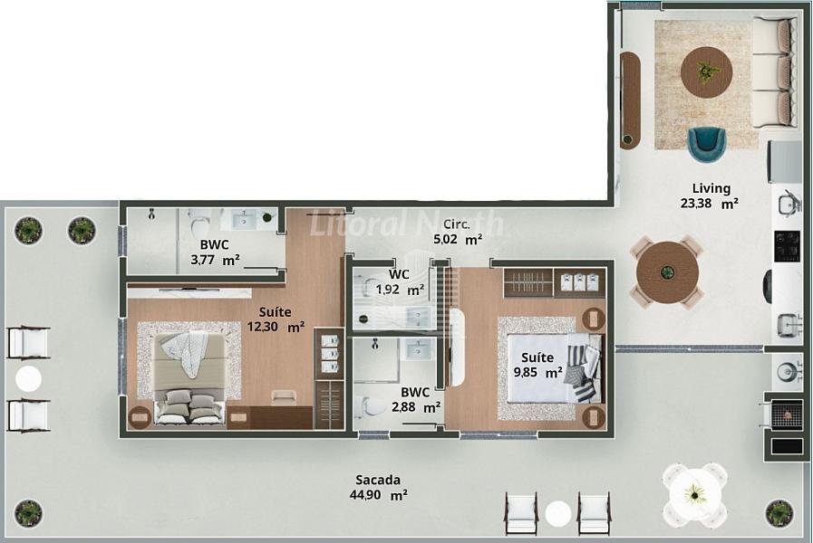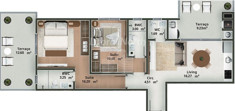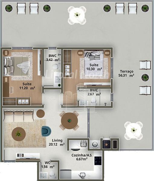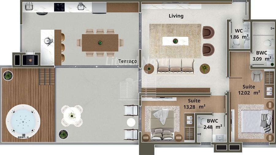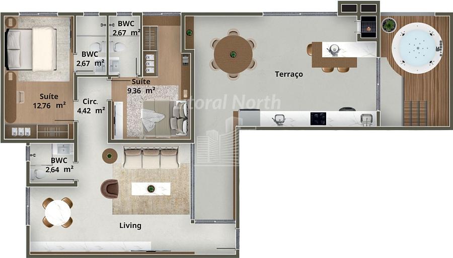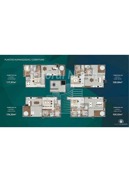 * Apartamentos de 2 Suítes, todos com Terraço, com Áreas Privativas que vão de: 61 Metros á 126 metros.